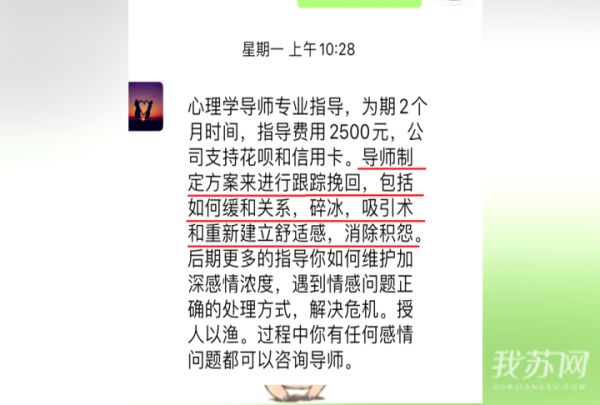 心理专家分析,年轻女性由于比较感性和涉世不深,往往更会购买这种所谓情感咨询服务。然而,这并不是专业的心理咨询,就算是非心理专业人士,以一个普通人的身份,给出情感建议,也不会像这样利用套路百般劝和。