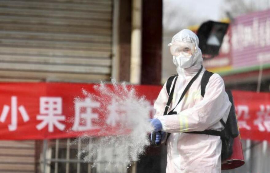 1月15日,石家庄消防救援支队藁城大队消防员在小果庄村村口路段消杀。当日,河北省石家庄市藁城区开展防疫消杀工作。 中新社记者 翟羽佳 摄