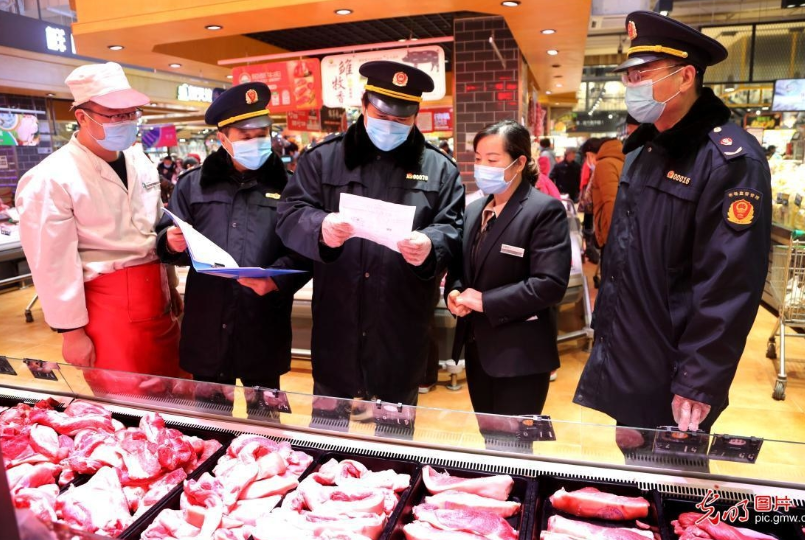 图为连云港市连云区市场监督管理局执法人员正在超市检查冷链食品