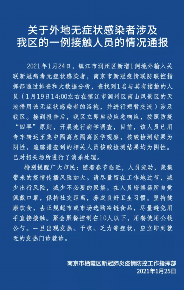关于外地无症状感染者涉及南京栖霞区的一例接触人员的情况通报
