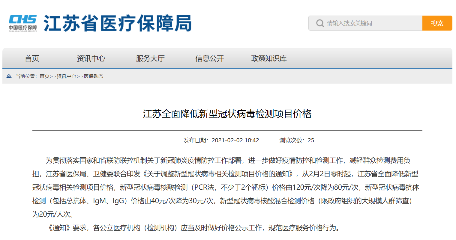 从2月2日零时起,江苏省全面降低新型冠状病毒相关检测项目价格,新型冠状病毒核酸检测(PCR法,不少于2个靶标)价格由120元/次降为80元/次,新型冠状病毒抗体检测(包括总抗体、IgM、IgG)价格由40元/次降为30元/次,新型冠状病毒核酸混合检测价格(限政府组织的大规模人群筛查)为20元/人次。