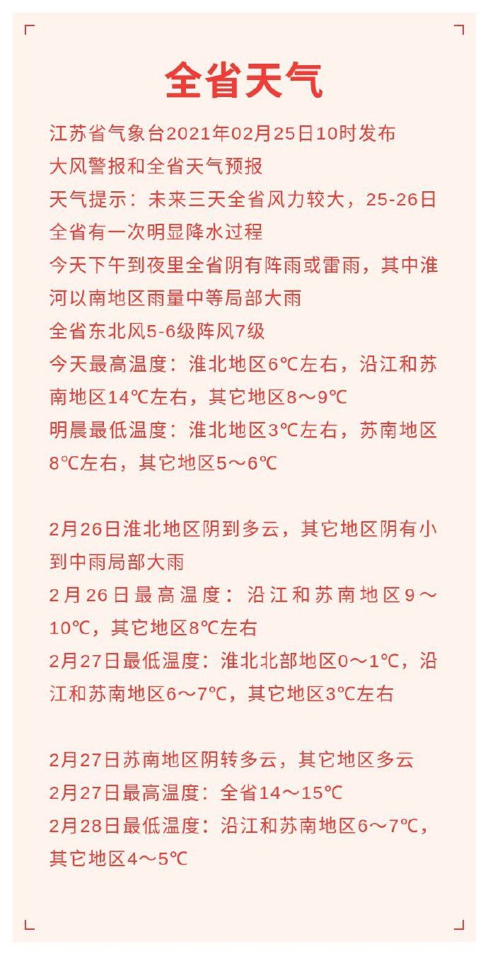 据江苏气象消息,今天下午到夜里全省阴有阵雨或雷雨,其中淮河以南地区雨量中等局部大雨,全省东北风5-6级阵风7级,今天最高温度:淮北地区6℃左右,沿江和苏南地区14℃左右,其它地区8~9℃,明晨最低温度:淮北地区3℃左右,苏南地区8℃左右,其它地区5~6℃。