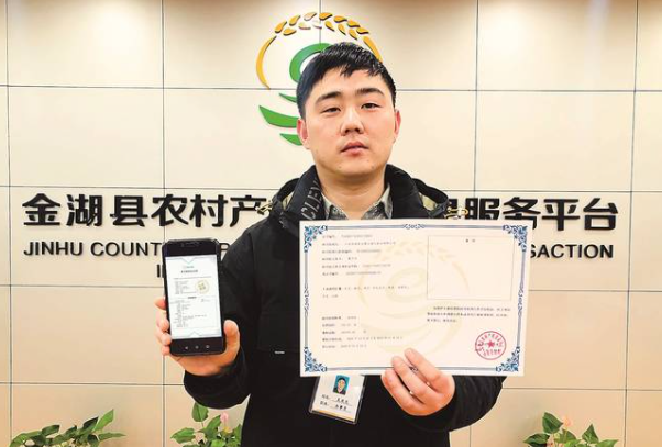 金湖县农村产权交易中心工作人员手持蚂蚁链电子证书和传统土地经营权抵押证书。(受访者供图)