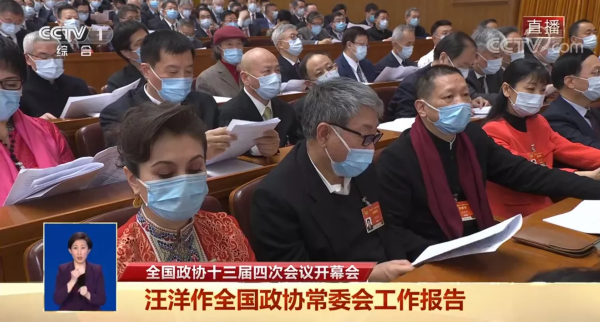 ▲政协开幕式直播画面(第一排右三为周建平)