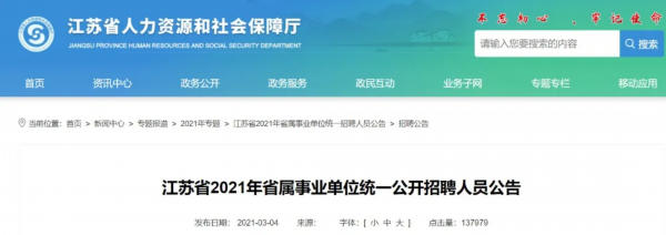 江苏省2021年省属事业单位统一公开招聘人员公告发布,3月11日起开始报名!↓ ↓ ↓