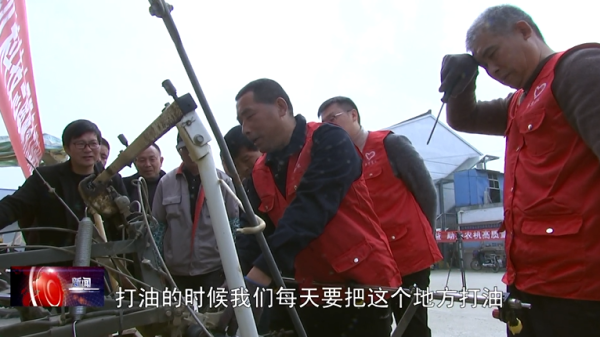 薛埠镇上阮村农户 杭庆华:“帮忙打打黄油、紧紧螺丝、修修秧针,这个都有点可以的,都自己会了,科技志愿者已经培训过多少次了。”