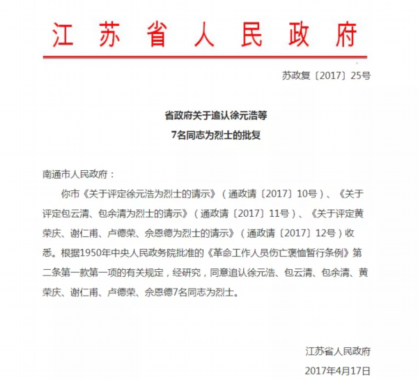 2017年4月,江苏省人民政府书面印发《省政府关于追认徐元浩等7名同志为烈士的批复》,同意追认徐元浩等7名同志为烈士。