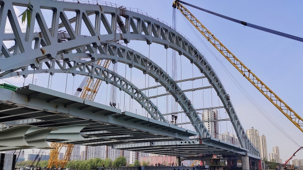 万福快速路为新建道路,西起运河路高架,东至万福大桥,道路全长3129米。跨京杭运河桥是快速路主线上的一座大型桥梁,全长224米,桥宽53.2米,双向八车道,设计时速80公里,为三跨连续钢桁架拱桥结构,横桥向设置三片拱肋桁架。主桥为无推力系杆拱桥体系,上部结构通过连续钢桁架拱肋、桥面系钢梁及系杆形成平衡,支承于桥墩上。大桥建成后将成为江苏省跨内河最宽的桁架拱桥。