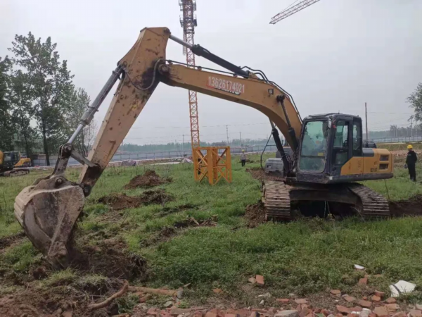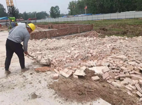 朱寨村桥西自然村农村集体土地退出村庄搬迁安置一期项目建设现场,施工人员紧张作业,安装塔吊、平整土地、开挖地基。