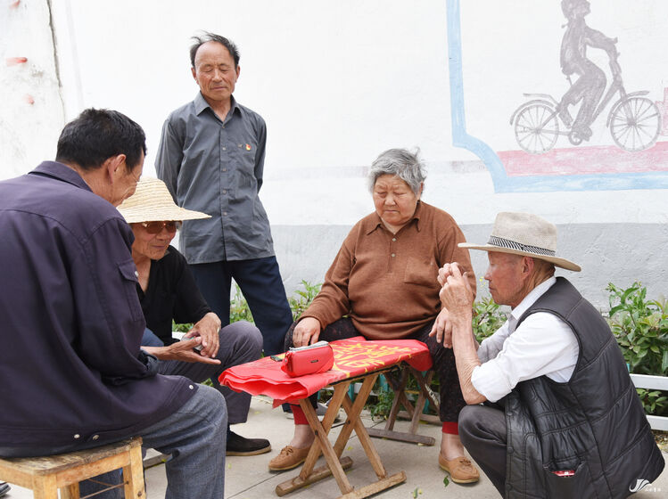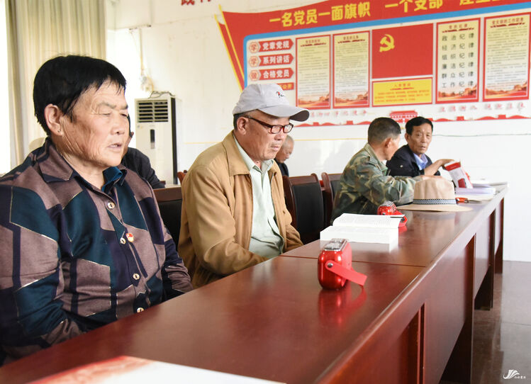 采访时,几名村里的老党员聚在一起,通过随身听,聆听提前录制好的节目《百炼成钢》。