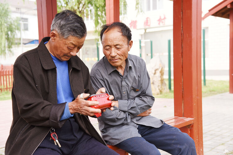 今年72岁有着45年党龄的老党员魏贤珍是汴塘镇一名露天电影放映员,刚一领到随身听,他就迫不及待地与搭档王长恩分享。