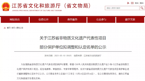 近日,江苏省文化和旅游厅发布公示,拟对75家省级非物质文化遗产代表性项目保护单位进行重新调整和认定。