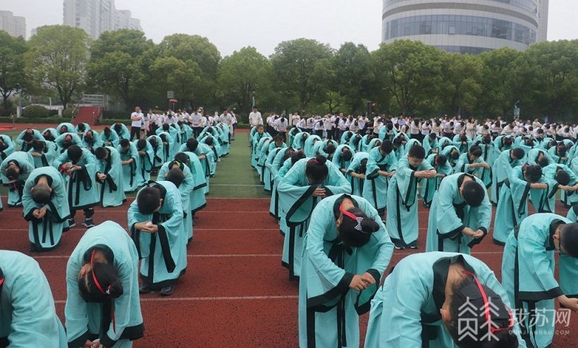 学校操场上,300名身穿蓝色传统汉服的学生整齐列队,犹如谦谦君子,或似窈窕淑女。奉匜沃盥、礼拜先师、成长印记、礼谢父母、君心宣誓等环节让人仿佛穿越到了古代,整场成长礼的每一个步骤都仿效古代文化礼仪,庄重典雅,温馨且感人。在最让人动容的“礼谢父母”环节,学生们向父母三行揖礼,感谢父母赐我生命、养我身体、送我读书。礼后,学生们情不自禁地投入了父母的怀抱,看到孩子逐渐长大懂事,一些父母眼中已闪烁着激动的泪花。学生家长殷莉告诉记者:“现在的孩子,尤其是这种中国传统文化我觉得应该更加的多方面的去宣传一点,让他们从一些行动中感受到感恩的心,我觉得活动很不错。”在“正衣冠、拜孔圣、谢师恩”等传统仪式教育中,孩子们在学会感恩、懂得立志、知晓责任与担当的同时,也收获了一份难忘的成长记忆。