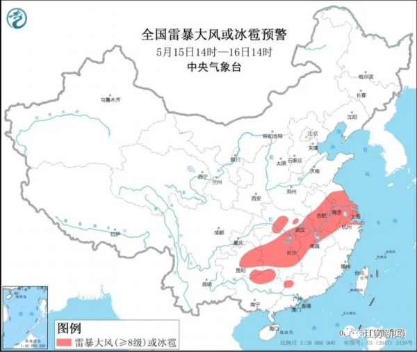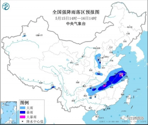 预计,5月15日14时至16日14时,山西中南部、河南南部和西北部、重庆东南部、湖北北部和东部、安徽、江苏中南部、上海、浙江北部、江西北部、湖南中北部、贵州东部、广西北部等地的部分地区有大到暴雨,其中,湖南东北部、安徽东南部、江苏南部等地局地有大暴雨(100~150毫米)。上述部分地区伴有短时强降水,小时降雨量30~50毫米,局地可达70毫米以上,局地伴有雷暴大风或冰雹等强对流天气。