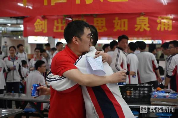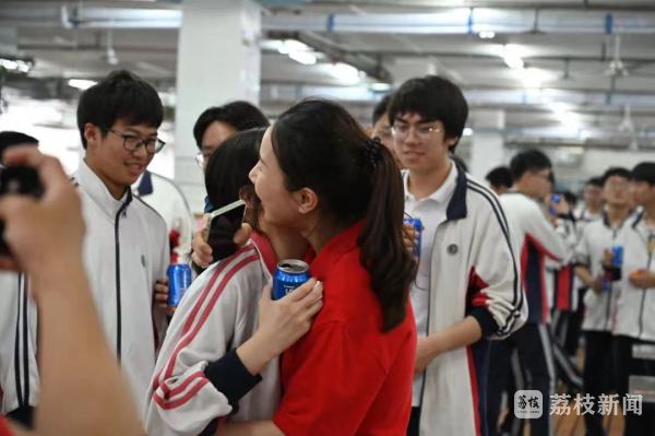 三年,一千多个日子里,难忘恩师情。老师为学生们带来了可乐和橙子,学生们忙着和老师拥抱、合影……高三(5)的男生们还趁机抱起了生物老师苑中原。