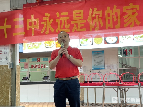 师生共进午餐,食堂里洋溢着欢声笑语。十三中学校长张恒柱说,两周后,学生们将迎来高考,希望通过助力餐会为大家加油。“在距离高考还有两周之际,德育处和年级部为大家组织高考幸运助力餐会,为大家壮行,14天之后,大家将走进高考考场,高中生活也将正式成为2021届高三人难忘的记忆。同学们,三年的卧薪尝胆,无数次的考场磨砺,你们早已经百炼成钢,高考只不过是你们再一次展现十三中的成功。现在在你们的行囊里,已经盛满了十三中人的祝福……电子屏上,每天滚动着一个个班级的祝福,高三的走廊里,张贴着每一个备课组的关怀,同学们,在高考的道路上,你们不是一个人在战斗,全校师生,你们的家长都在关心着你们,学校会永远记住你奋斗的模样!”