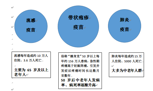 以带状疱疹为例,中国50岁及以上人群每年新发带状疱疹病例约为156万例。2010年中国50岁及以上人群约900万患带状疱疹,造成超过77亿元的经济负担。带状疱疹疫苗能有效改善这一情况,其能在50岁及以上中老年群体中产生超过90%的预防效力。