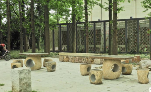 这块小游园充分利用了原先生长的树木,同时点缀山石,营造了旱溪,并设置长条型条石、石桌、石凳等。