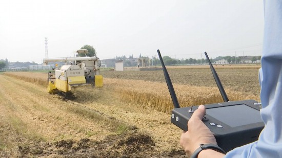 据了解,现场有5000多盒秧苗正在进行集中“暗化育秧”,三四天后即可发芽。室外稻田里,高速插秧机已马力全开,一小时可插四五亩地。同时开展的夏收工作,也有无人收割机来“助阵”,农技人员在田边就可实现遥控指挥。伴随着阵阵轰鸣声,“农机精兵”在麦田里穿梭,没过几分钟,一亩地不仅收割完成,麦秆也直接切碎在了地里。“武进在全省的粮食生产全程机械化中名列前茅,我们目前的机械化水平是96%,位列全省第一。”武进区农业农村局农业科技服务站站长费士敏介绍。