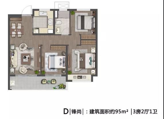建筑面积约95㎡,为三室两厅一卫设计,户型方正,三开间朝南,拥有南向通长阳台,采光、观景视野非常棒。