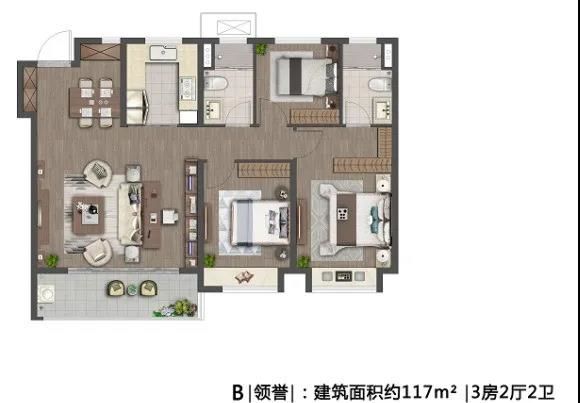 建筑面积约117㎡,打造了更大尺度的三房两卫设计,三开间朝南、南北通透,动静分区,开间约5.4米的宽境阳台,让视觉空间更开阔。
