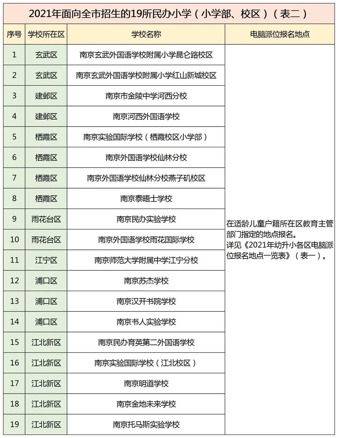 需要提醒的是,今年有19所民办小学(小学部、校区)面向全市招生,监护人不要直接前往这些学校现场报名(除非该校恰好是孩子户籍所在区教育部门指定的报名点)。各区教育部门指定的报名地点见表一,面向全市招生的民办小学见表二。