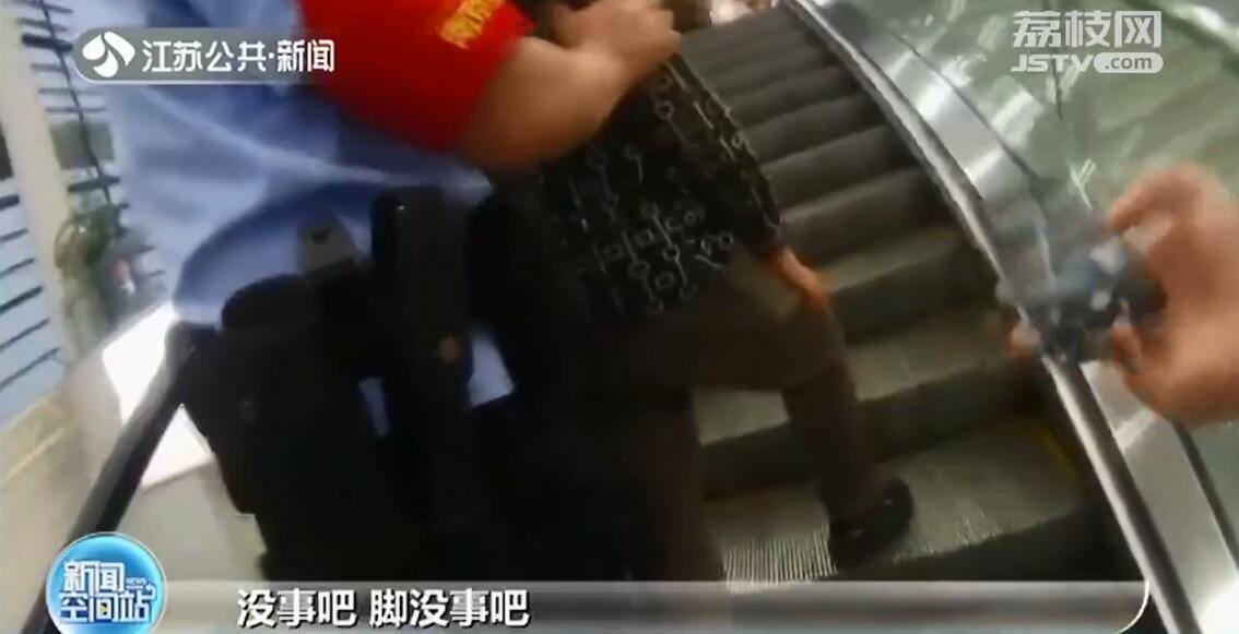 南京站派出所民警刘宇回忆:“当晚19时左右,我跟我同事正常在南京站北候车室安检区域巡逻,看到一个老人乘坐扶梯的时候突然摔倒了。情况很危急,她头已经贴在电梯上了,老人一手拿着行李,一手乘坐扶梯,行李没放稳,行李倒了,连带着老人带倒了。”