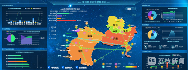 登录常州“智慧能源”管理平台,在“城市级能源管理”功能模块,利用大数据可分析全市产业结构、产值、能源消费和生产、碳排放强度之间的关系,并可仿真推演2020年至2060年碳排放情况,为政府部门制定“双碳”相关政策、指导产业转型升级、增加区外清洁能源来电和内生新能源等提供决策支撑。