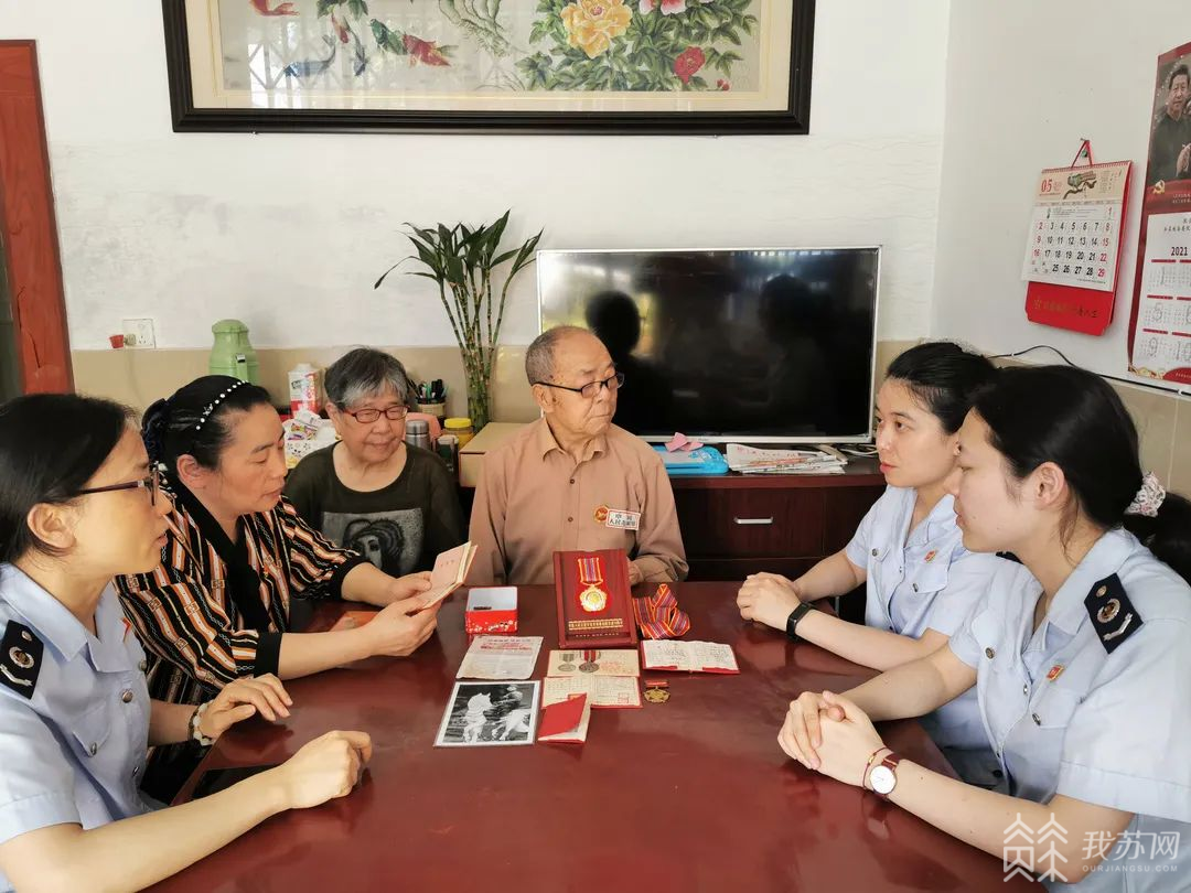 为传承伟大抗美援朝精神,重温党的百年辉煌历程,宜兴和桥税务分局党支部书记范文艳与劳动社区党总支书记闵健芬带队上门走访社区两位抗美援朝老兵。