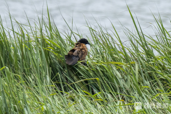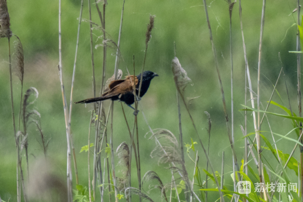 最近,句容赤山湖国家湿地公园工作人员周宜祥在环湖巡查时,监测到一对通体黑色、肩翅栗色的“怪鸟”。它们时而在芦苇之间窜来窜去,时而在草丛中驻足歇脚。凭借多年的鸟类监测经验,他判断这是一对从未见过的鹃形目攀禽,它们极有可能正在筑巢。他迅速请来摄影师进行拍摄记录,并联系专家对记录到的画面仔细辨认。