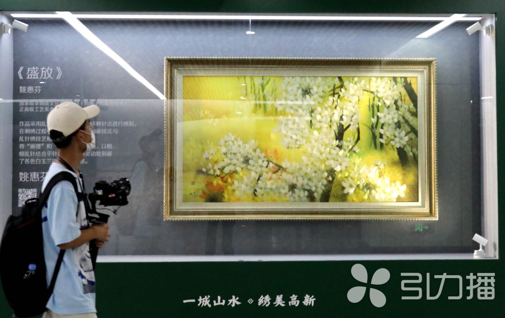 现场展示的名家苏绣作品更是精美绝伦。薛金娣、张雪绣制的《索山桥西》站名门牌,以苏绣中细平绣的针法为主,辅以乱针绣,绣出了冰裂纹效果,充分展现了苏绣绣法的精细。姚惠芳的作品《盛放》,将油画技法融入乱针绣技艺,自由灵动地刻画了白玉兰之美。汤晓红绣制的《如梦江南》,借助苏州园林建筑元素中的隔扇门和飞檐传递江南风情,体现了苏绣精细雅洁的特点。