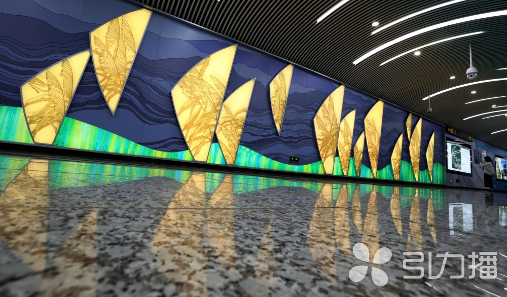 阳澄湖南站的展示主题是“半岛新生活,我的第七天”,着力展现“印象”中的阳澄湖半岛风光。站点空间整体色彩鲜亮,自然野趣、阳光活力、时尚健康这些景区元素,通过个性化的插画设计和卡通形象的布展加以呈现。站厅3号出口旁设立了一个旅游咨询点,这里有阳澄湖半岛主要景点的简介,还可以直接扫码购买重元寺、华谊兄弟电影世界等景点的门票。往里走是一个沉浸式互动光影厅,墙面上轮番播放着《鱼戏荷塘》《繁花盛开》的影片,手指轻触,鱼儿飞跃,轻轻一拂,花开满墙。
