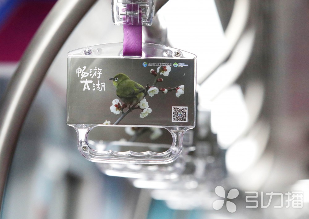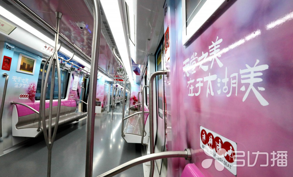 为了增加乘客的体验感,5号线此次专门推出了“太湖文化专列”,通过精心装扮,将列车打造为一个流动的文化空间。在列车车身外部的装饰中,提取了太湖度假区的标志性景点元素,配上写意山水画卷底纹,展现了太湖烟波浩渺的景观。车厢内以粉色和蓝色为主色调,太湖度假区的四季主打花树大面积铺开,樱花、梅花、荷花、银杏,还有太湖湿地的水风车、太湖边的芦苇荡等,乘客仿佛身临其境,被太湖优美的自然风光环绕。