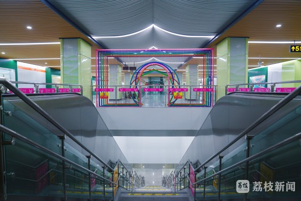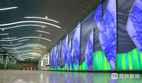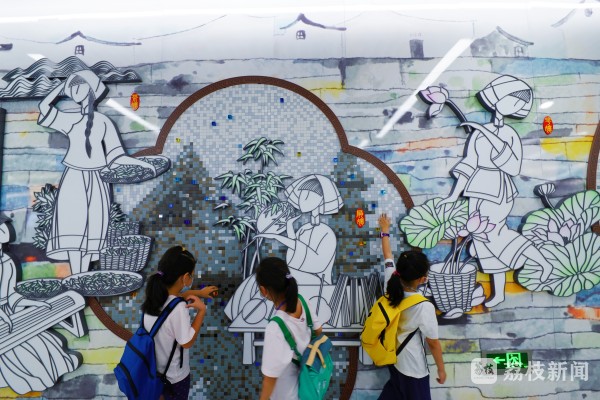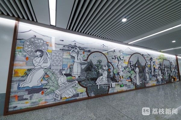 太湖香山站《湖光山色》文化墙,通过光色科技,展现了太湖早、中、晚的风光水韵,增加了人与空间的交互乐趣。灵岩山站《姑苏十二娘》文化墙,以江南古镇为背景托衬,将船、绣、织、茶等12类传统行业人物汇于一堂,展现了吴地女性的秀美风姿。