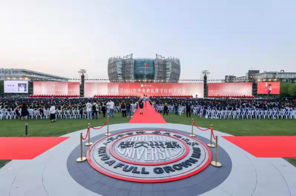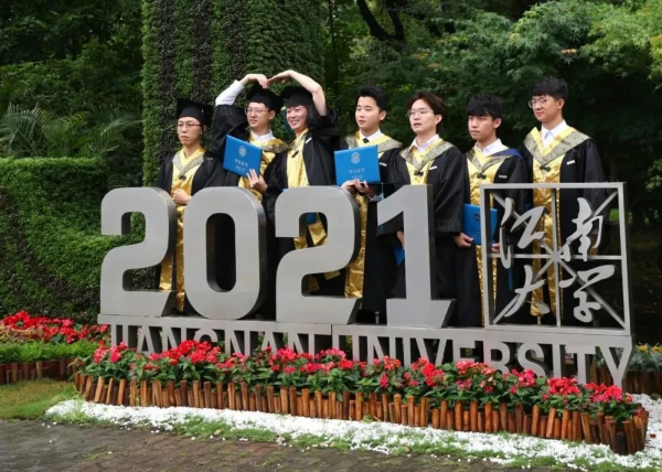 6月19日上午,2021年江南大学毕业典礼暨学位授予仪式于学校体育馆隆重举行。本次毕业典礼采取线上线下相结合的方式同步举行,500余名毕业生代表在现场参加典礼,未能到场的毕业生通过现场直播的方式参加“云典礼”。今年的毕业典礼,江南大学相关部门精心筹备,通过文化装置、照片墙、J形“江南树”等毕业专属景观,定制流苏、水晶印章、尺子、戒指等特色毕业礼物,毕业季MV、祝福视频、毕业晚会等形式,增强毕业生对母校的认同感,营造了温馨和谐的毕业氛围。