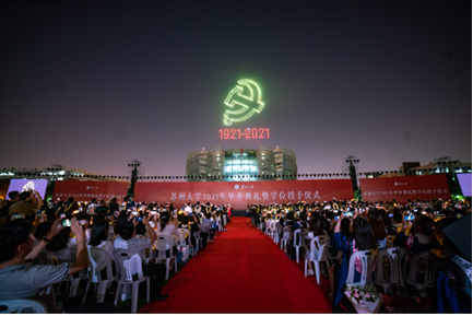 6月22日晚,苏州大学在独墅湖校区举行2021年毕业典礼暨学位授予仪式,这是学校首次在夜空下举办户外毕业典礼,共10890名2021届毕业生参加典礼,学校还兑现承诺邀请了自主报名的623位2020届毕业生参加。典礼最后,无人机在夜空升起,组合成党徽、“永远跟党走”“苏大荣光,由你来续”等字样,致敬建党百年,饱含着苏大师生对党和国家的无限深情和美好祝愿,也蕴藏着学校对远行学子的深切祝福。