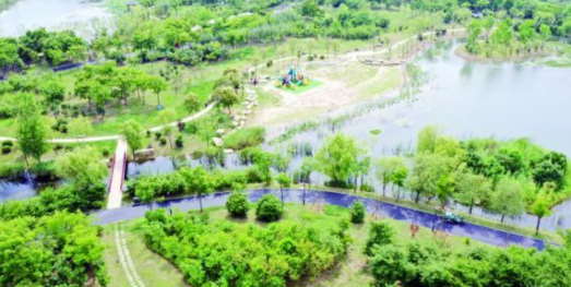 原本无人问津的荒地,经过改造提升后,不仅实现了水质提升,还增加了休闲凉亭、健身步道、座椅等设施,每天都吸引着越来越多的居民前来游玩。生态文化公园占地面积220亩,公园内栽植各类乔木3947棵、灌木2816棵、水生植物2000余株。同时,公园内设有健康宣传栏、健身器材、锻炼场地、休闲广场等功能区,健康步道长600米,每间隔100米标有米数和步数,沿路设立50多个健康宣传牌,还有红色故事、信仰传承、英模事迹、重大事件等党史板块,使历史文化、红色文化、农耕文化和生态文化交相辉映,真正实现集景观、人文、健康、休闲、娱乐于一体,形成了家门口“5分钟美好生活圈”。