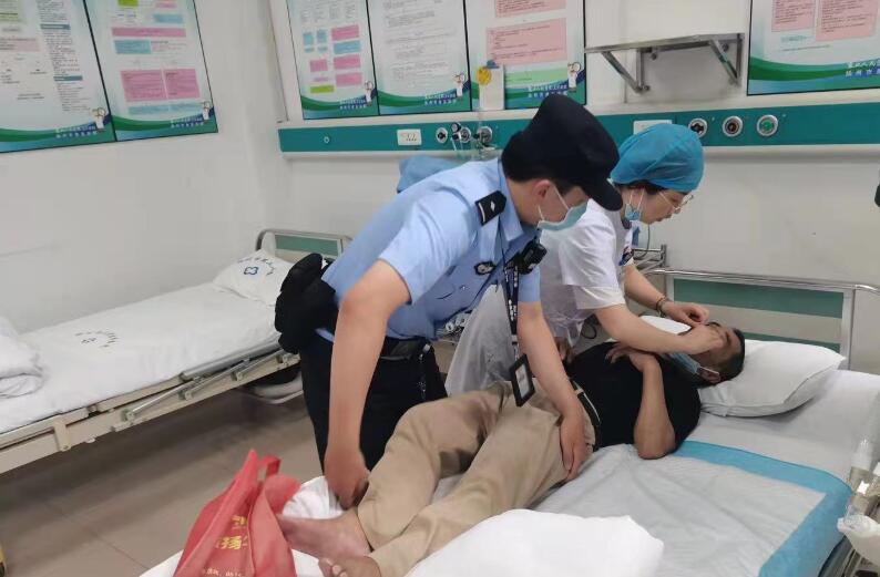 接警后,民警安冬、辅警卞东迅速赶往现场。抵达现场后,发现有一位老人瘫倒在路边,脸色苍白,意识模糊。报警人潘女士焦急地说道:“刚刚我骑车经过这里,看见这位老人突然昏倒在人行道,车辆来来往往太危险了,我就赶紧把老人扶到了路边......”民警欲将老人扶起,但老人体力不支,无法站立。无奈之下,安冬只好先将老人靠在树下,一路小跑来到了第二人民医院的急诊大厅,向工作人员说明情况后借来了轮椅,用轮椅将老人送到了二院救治。