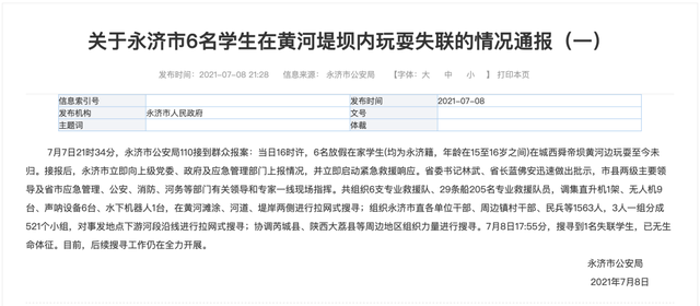 7月8日晚,永济市人民政府网站发布情况通报称,6名学生在黄河边玩耍失联,其中一人于8日17时55分被找到,但已无生命体征,后续搜寻工作仍在全力开展。