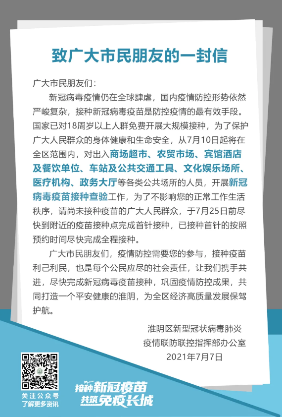 7月20日起,我区将对出入商场超市、农贸市场、宾馆酒店及餐饮单位、车站及公共交通工具、景点、医疗机构等各类公共场所的人员,开展新冠病毒疫苗接种查验工作(接种信息实时上传至苏康码)。请年满18周岁、尚未接种首针以及首针接种后满21天尚未接种第二针的居民朋友,携带身份证尽快到相关接种点接种。(请关注“淮安区疾控中心”微信公众号,及时了解疫苗接种信息。)