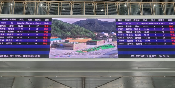 今天上午,记者在连云港火车站购票大厅看到,显示屏上显示,G8316连云港—徐州东、G4291兰州西—连云港、G2084荣成—武汉、G289长沙南—青岛、G2261银川—青岛北、G1849长沙南—烟台、G4292连云港—兰州西、G2683兰州西—威海等多趟旅客列车停运。据了解,7月21日,连云港火车站共停运列车43趟,其中受郑州暴雨影响导致列车停运37趟。
