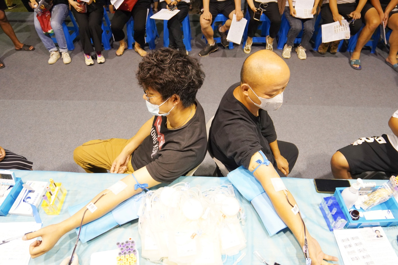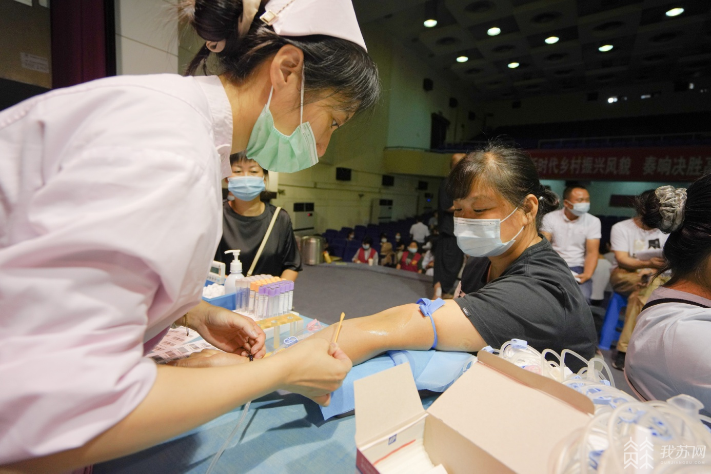 一走进影剧院内部,就看见“您的献血,是托起他人生命的希望”横幅挂在中央,四周悬挂着各类宣传标语。舞台上面和正前方,献血队伍人头攒动,里面既有参加过多次无偿献血的“老将”,也有初次上阵的“新兵”。而采血的医护工作者们则坐在桌前,在为志愿者们采血的同时,耐心叮嘱他们采血结束后需要注意的事项,同时还有专业的工作人员为初次献血的志愿者讲解献血常识和相关政策。“我们不仅为每一位完成献血的志愿者发放献血证,还现场为他们提供热牛奶和杂粮馒头补充营养。除此之外,我们今年还准备了水杯、洗发露等实用小礼品,为爱心的传递贡献一份绵薄之力。”现场维护秩序的工作人员介绍道。