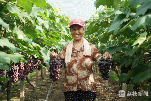 “今年葡萄大丰收,果子甜,能卖个好价钱!”走进泰兴市曲霞镇印达村,葡萄的果香味扑面而来,葡萄种植户吴根女笑得合不拢嘴。在她身后成片的葡萄大棚里,一串串葡萄挂满枝头,十分诱人。