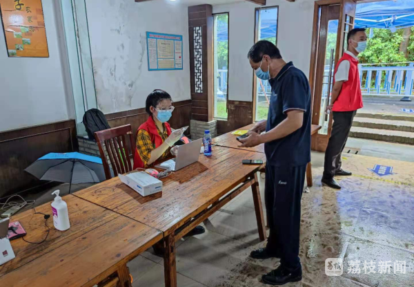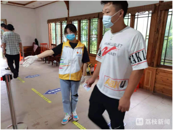 来自谷里街道荆刘村大孙村的孙文,同时也是江宁街道洪幕社区的一名工作人员。7月25日傍晚她满头大汗、匆匆忙忙赶到荆刘村部做志愿服务。其实来之前,她在江宁中学的核酸检测志愿服务才刚刚结束。