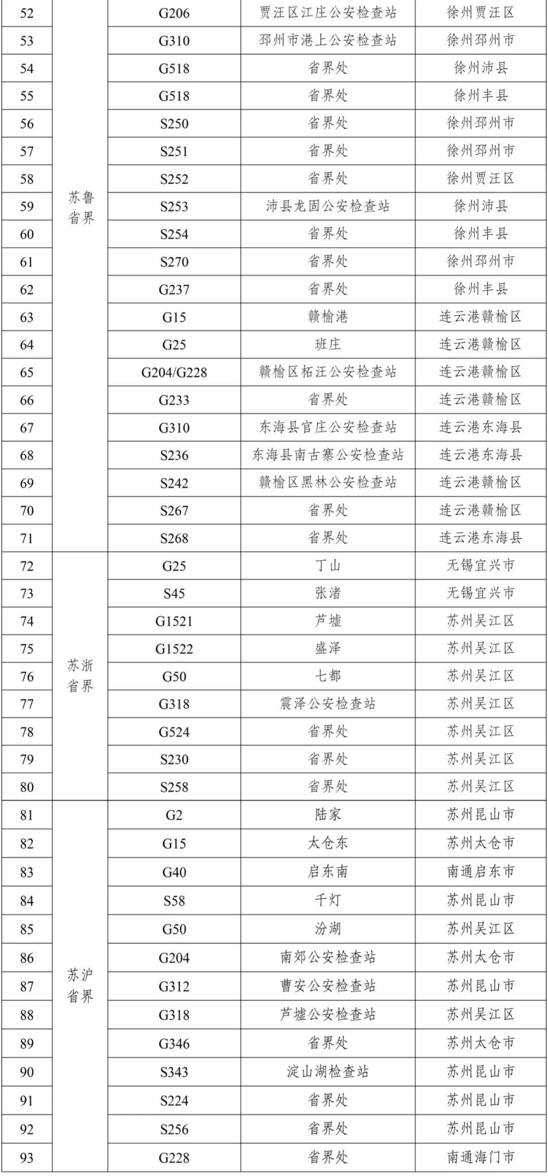 环苏查验点:在环苏省界公路共布设“离苏查验点”93个。其中,苏皖省界46个,苏沪省界13个,苏鲁省界25个,苏浙省界9个。