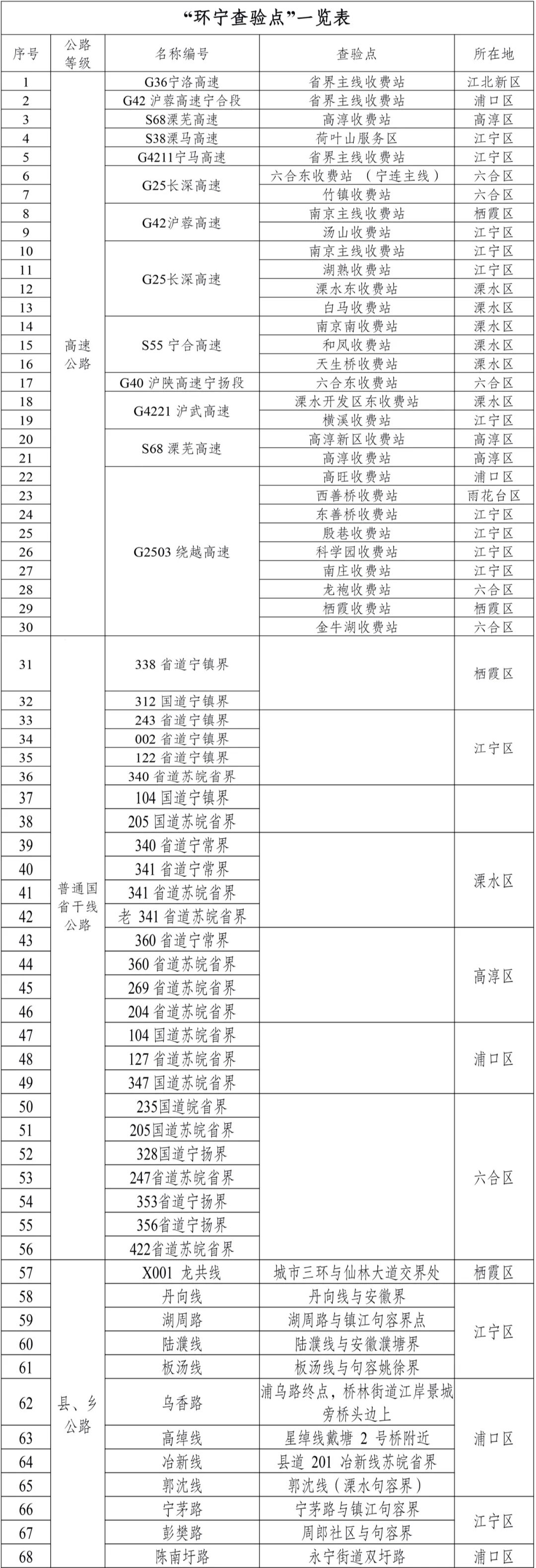 环宁查验点:南京市在环宁市界公路共布设“离宁查验点”68个。