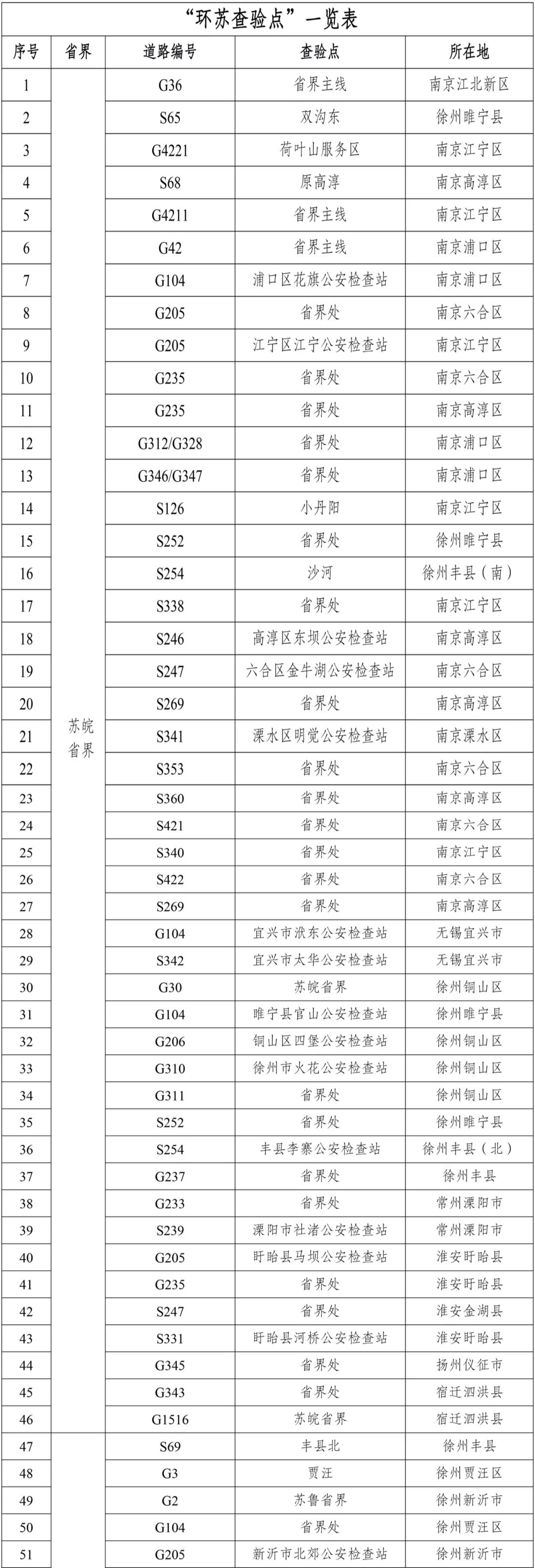 (三)“环苏查验点”中的南京周边省界查验点,一律执行“环宁查验点”查验要求,对所有离宁车辆驾乘人员进行查验。