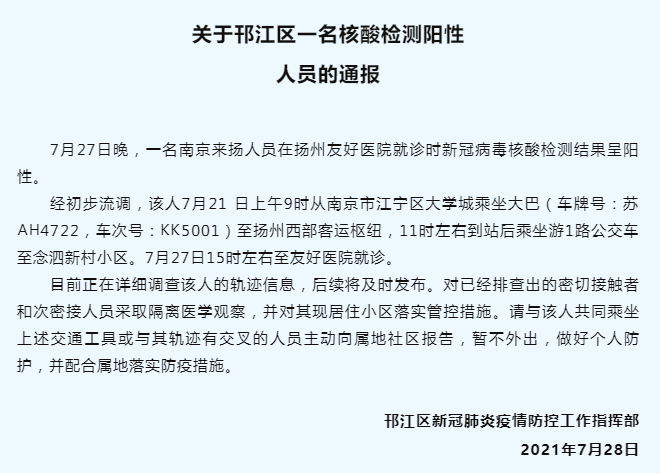 经初步流调,该人7月21日上午9时从南京市江宁区大学城乘坐大巴(车牌号:苏AH4722,车次号:KK5001)至扬州西部客运枢纽,11时左右到站后乘坐游1路公交车至念泗新村小区。7月27日15时左右至友好医院就诊。