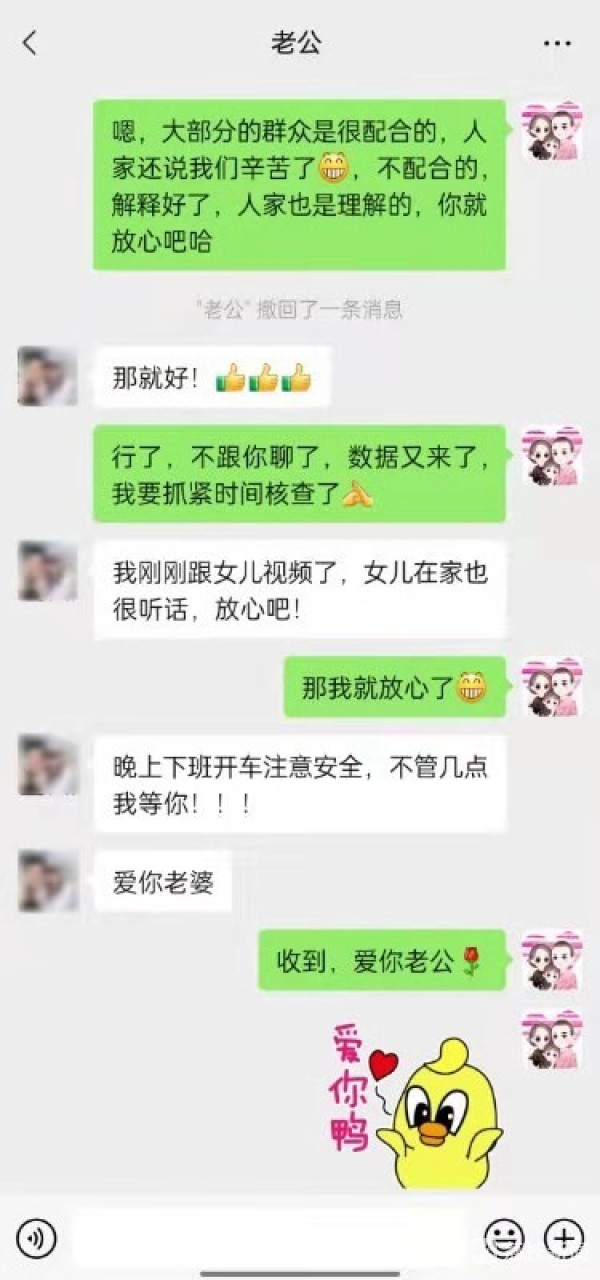 记者了解到,陈星星和爱人两地分居,爱人尹训文在北京是一名司法警察。由于疫情防控的需要,今年夫妻俩已经有两个多月没有见面了,只能通过手机给对方加油鼓劲。“这个任务很要紧的,你可不能有马虎,家里的事,有咱爸妈呢,你就安心工作。”当初,得知妻子主动请缨参加疫情防控工作,尹训文便给妻子打气。