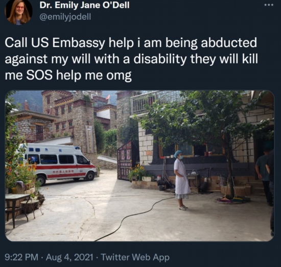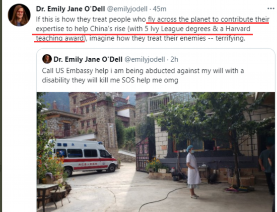 多张来自境外社交媒体上的截图显示,这名美国教授曾于8月4日在她的境外社交账号“推特”上发帖,说她要向美国大使馆求救,因为她正在被中国政府的人员“绑架”,而且中国政府还派出了“20多名警察来抓她”,要将她送到“新冠疫情肆虐的城市”里“杀死”她。